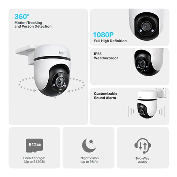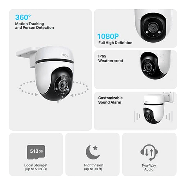 Video 1080p en directo. Videos y fotos más nítidos y con más detalles en cualquier situación. Detección AI de movimiento con notificaciones. La cámara identifica personas y notificaciones al móvil al detectar un movimiento sospechoso. Visión Panorámica 360º. La cámara se mueve vertical 130º y horizontalmente 360º para grabar todos los ángulos. Vision Nocturna. Tapo C500 es capaz de grabar en total oscuridad a una distancia de hasta 29 metros. Resistente al agua y al polvo IP65. La cámara está herméticamente sellada frente al agua y el polvo. Libertad de instalación. Instálalo en paredes o techos, tú decides donde.
