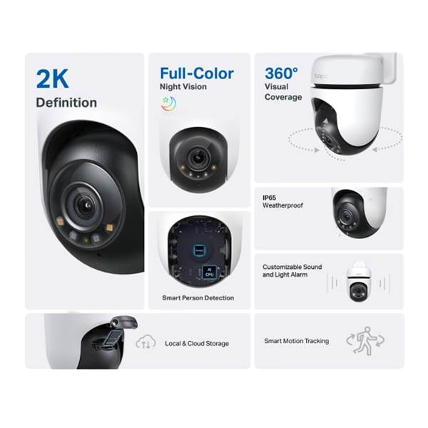 Vídeo alta calidad 2K. Con una resolución de 2304 x 1296 px, Videos y fotos más nítidos y con más detalles en cualquier situación. Detección y seguimiento inteligente de movimiento. La cámara identifica y realiza seguimiento de personas en las zonas que tú definas, enviando notificaciones al móvil. Visión Panorámica 360º. La cámara se mueve verticalmente 130º y en horizontal 360º para grabar todos los ángulos. Visión nocturna a todo color. Tapo C510W es capaz de grabar en total oscuridad a color. Resistente al agua y al polvo IP65. La cámara está herméticamente sellada frente al agua y el polvo. Detección múltiple. La inteligencia artificial identifica personas, creando zonas o líneas de detección para recibir notificaciones al móvil cuando son traspasadas. Alarma de luz y sonido personalizable. Graba tu propio audio para usar como alarma. Almacenamiento seguro. Guarda los vídeos en una tarjeta microSD de hasta 512GB o utilizando los servicios de almacenamiento en la nube Tapo Care.
