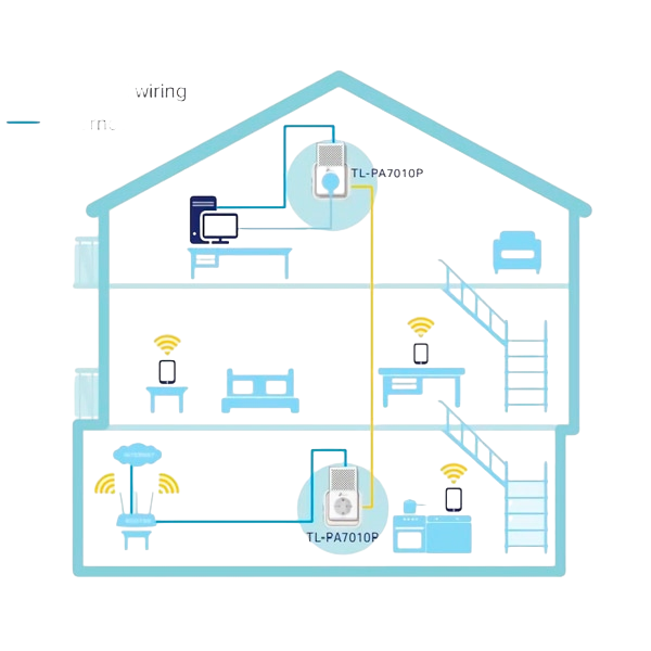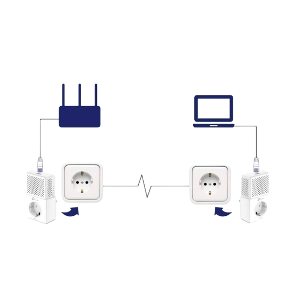 Conecte un adaptador powerline a su router; conecte el otro adaptador powerline al enchufe de pared de otra habitación, conéctelo al dispositivo habilitado para Internet vía Ethernet – ¡y listo!