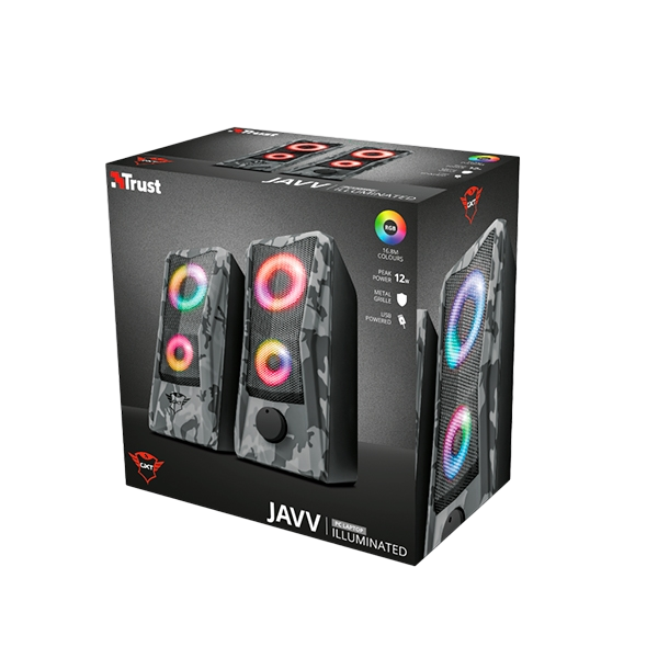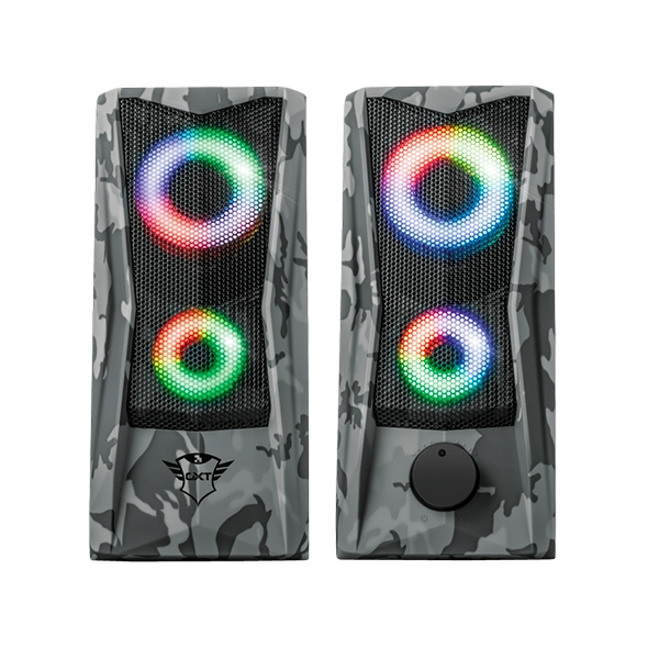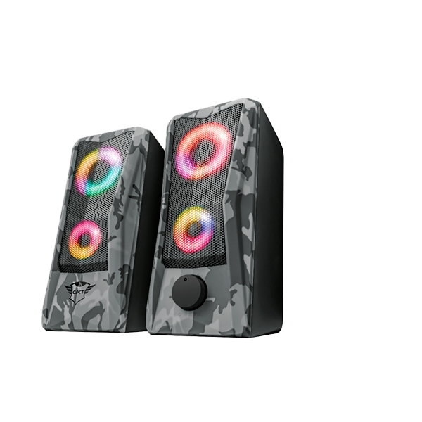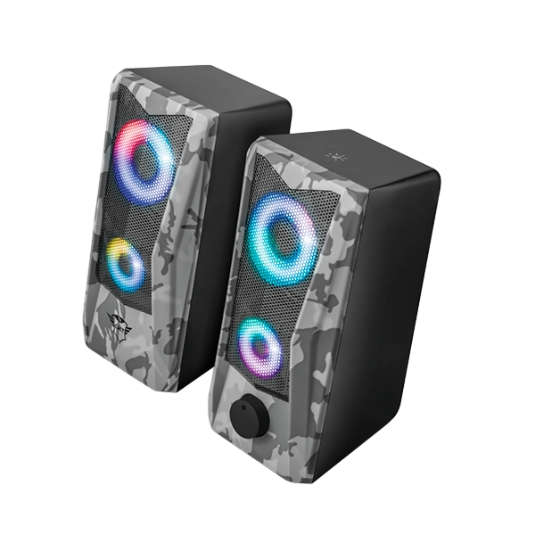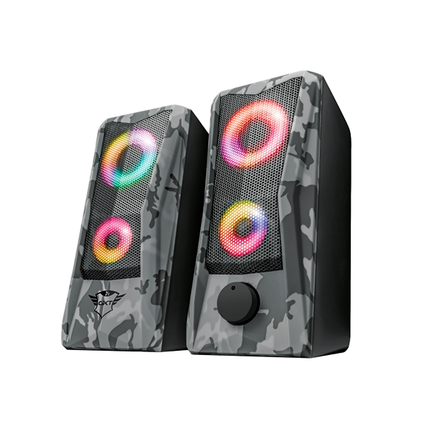 Con un diseño compacto, el juego de altavoces GXT 606 Javv 2.0 con iluminación RGB hace gala de un atrevido estampado de camuflaje y coloridas luces RGB que aumentan el hambre de victoria. Disfruta de tu equipo de audio en estéreo sin tener que usar auriculares. Es muy fácil: basta con conectar el cable USB y auxiliar al portátil y listo.