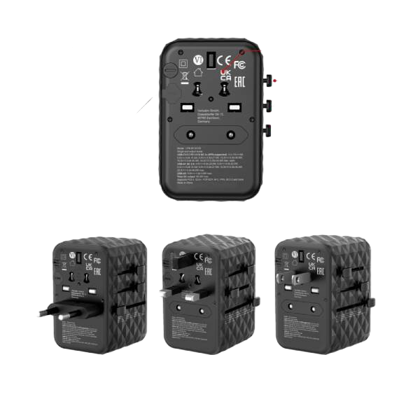 Verbatim UTA-05 GaN III 65W USB-C – Cargador de Pared Universal. El adaptador de viaje universal GaN III de Verbatim puede utilizarse en más de 180 países: llévelo a todas partes y no se quede nunca sin batería. Este enchufe múltiple mundial a mundial le permitirá conectarse a cualquier alimentación eléctrica local de todo el mundo y recargar sus dispositivos necesitados de energía, como ordenadores portátiles, smartphones, altavoces Bluetooth, tabletas, baterías externas, etc. Solamente tiene que empujar los deslizadores del lateral del multienchufe para ver los tres enchufes internacionales más comunes: UE, Reino Unido y EE. UU.- y girar las clavijas para las tomas de Australia o China. El compacto y potente adaptador de viaje universal GaN III de Verbatim permite cargar cinco dispositivos simultáneamente a través de la toma de alimentación de CA y los dos puertos USB-C y dos USB-A.