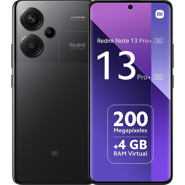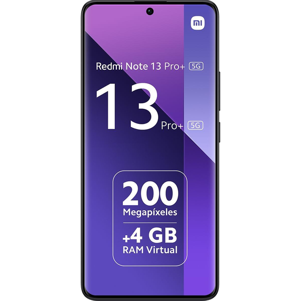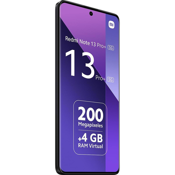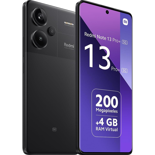 El Xiaomi Redmi Note 13 Pro+ 5G en color Midnight Black es un smartphone de alta gama que combina diseño elegante y rendimiento excepcional. Su pantalla AMOLED de 6,67 pulgadas ofrece una resolución de 2712 x 1220 píxeles, proporcionando imágenes nítidas y colores vibrantes. Con una tasa de refresco de 120Hz y un brillo máximo de 1800 nits, garantiza una experiencia visual fluida y clara incluso bajo luz solar directa. La protección Corning Gorilla Glass Victus asegura durabilidad y resistencia a arañazos y caídas.